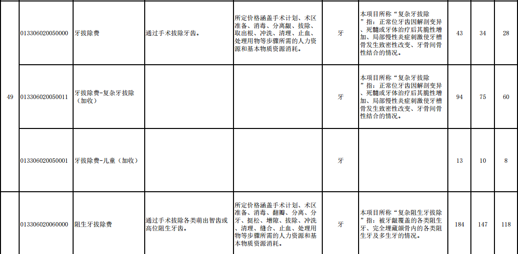 口腔外科类方面,普通牙拔除费三级机构为43元/牙,二级机构为34元/牙,一级机构为28元/牙;阻生牙拔除费为184元/牙,二级机构为147元/牙,一级机构为118元/牙;复杂阻生牙再加收92元,二级机构为74元/牙,一级机构为59元/牙。