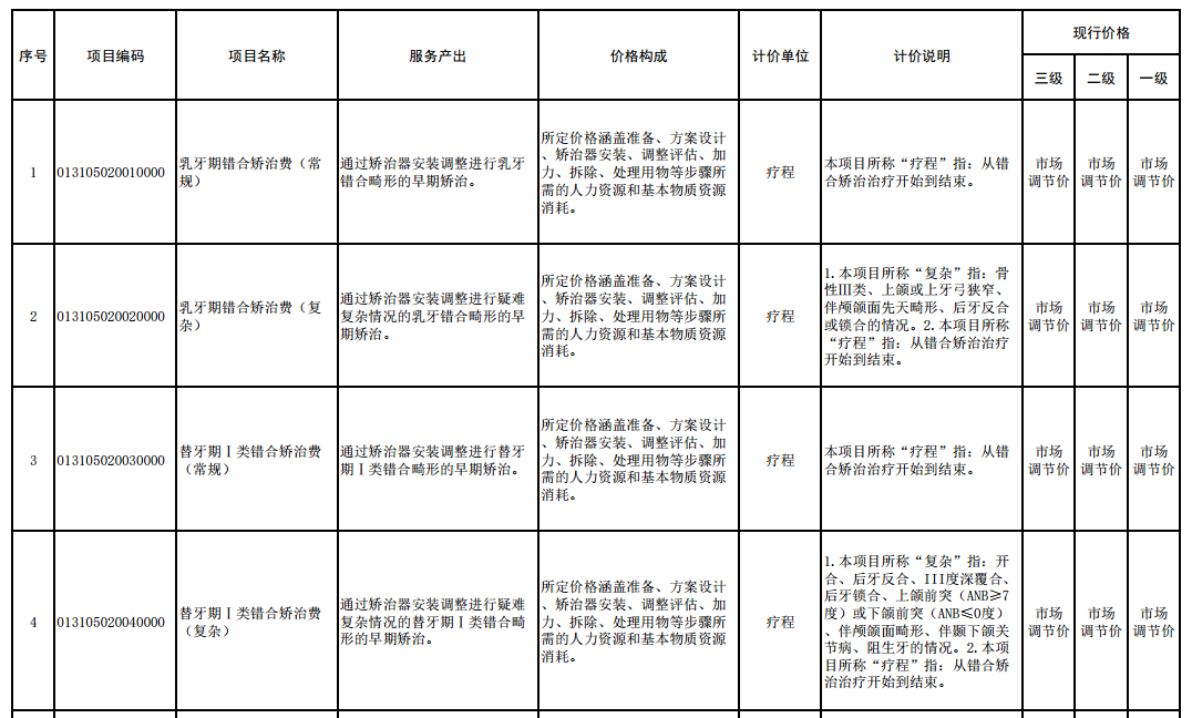 值得注意的是,正畸矫治类全部项目均执行市场调节价,包括乳牙期、替牙期各类错合矫治费、恒牙期各类错合矫治费及矫形功能治疗费,正畸支抗钉植入费、错合畸形治疗设计费、口腔固定保持器安装及拆除费亦同;美容相关项目如牙齿漂白费、前牙形态修复费、预成冠修复费亦均为市场调节价。